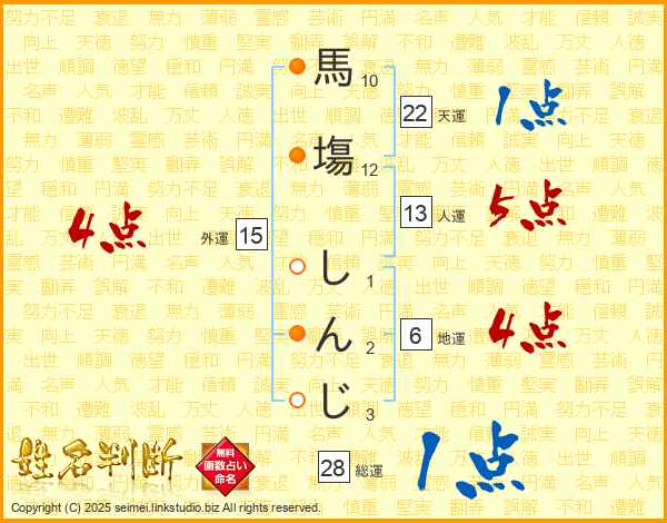 馬(10画)塲(12画) し(1画)ん(2画)じ(3画)