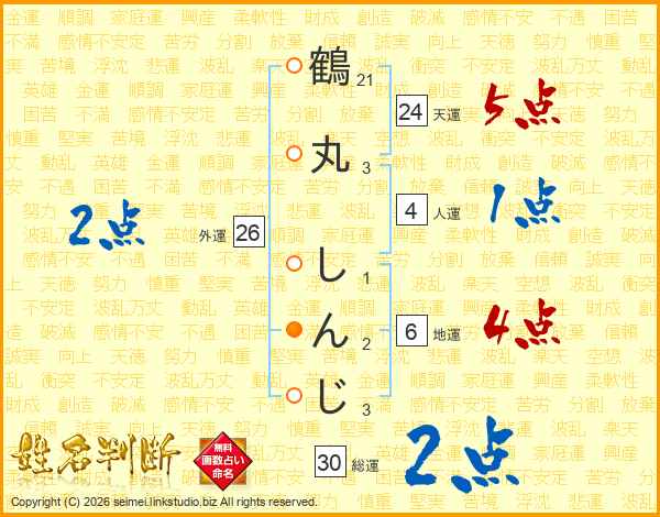 鶴(21画)丸(3画) し(1画)ん(2画)じ(3画)