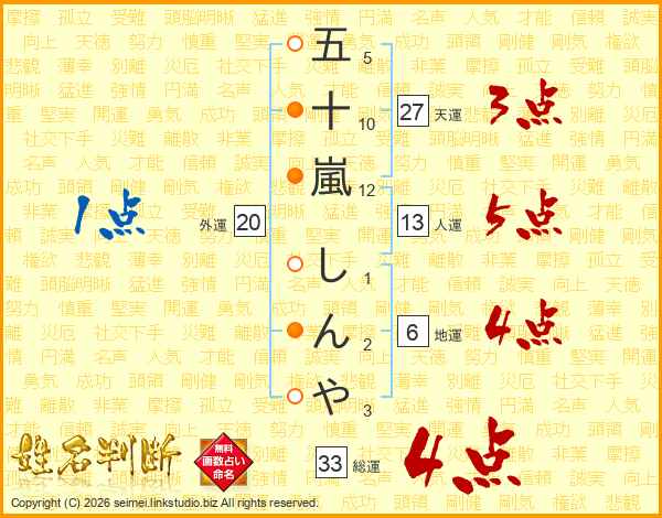 五十嵐しんやさんの総運は33画の4点!