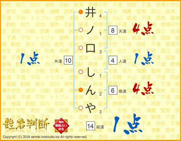 井(4画)ノ(1画)口(3画) し(1画)ん(2画)や(3画)