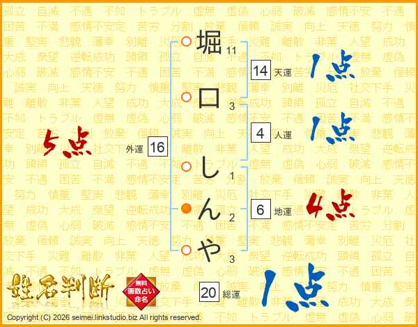 堀(11画)口(3画) し(1画)ん(2画)や(3画)