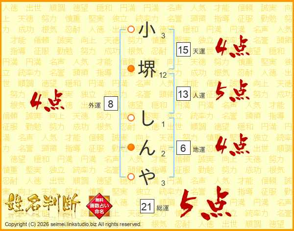 生活面を象徴する運勢です。外部から受ける影響力を表し、結婚運、家庭運や職場、環境への順応性を表します。総運から人運を引いた画数。姓や名が1文字の場合を除く。