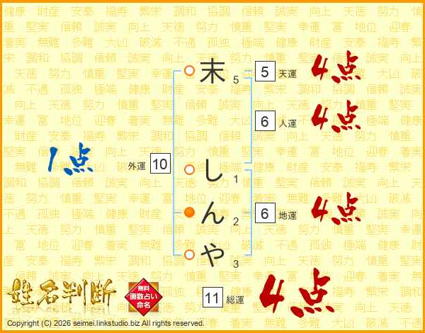 生活面を象徴する運勢です。外部から受ける影響力を表し、結婚運、家庭運や職場、環境への順応性を表します。総運から人運を引いた画数。姓や名が1文字の場合を除く。