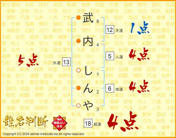 武(8画)内(4画) し(1画)ん(2画)や(3画)