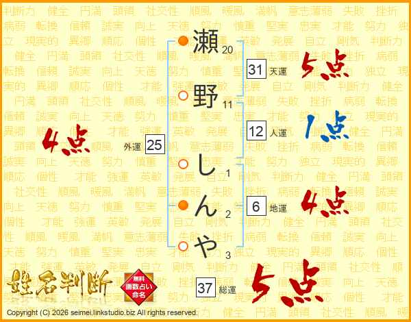 瀬(20画)野(11画) し(1画)ん(2画)や(3画)
