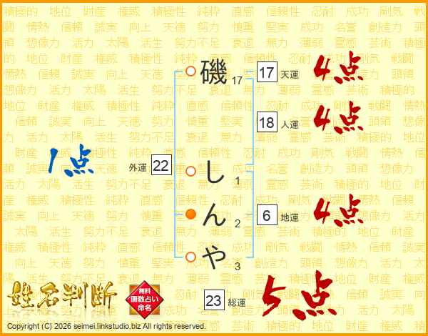 生活面を象徴する運勢です。外部から受ける影響力を表し、結婚運、家庭運や職場、環境への順応性を表します。総運から人運を引いた画数。姓や名が1文字の場合を除く。