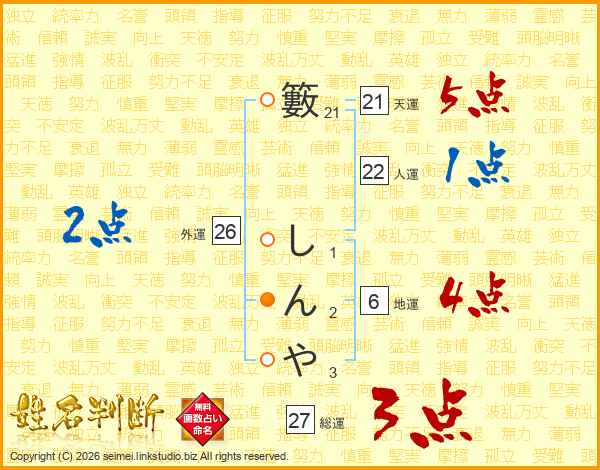 生活面を象徴する運勢です。外部から受ける影響力を表し、結婚運、家庭運や職場、環境への順応性を表します。総運から人運を引いた画数。姓や名が1文字の場合を除く。