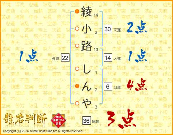 綾(14画)小(3画)路(13画) し(1画)ん(2画)や(3画)