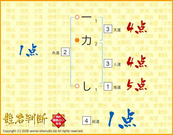 生活面を象徴する運勢です。外部から受ける影響力を表し、結婚運、家庭運や職場、環境への順応性を表します。総運から人運を引いた画数。姓や名が1文字の場合を除く。