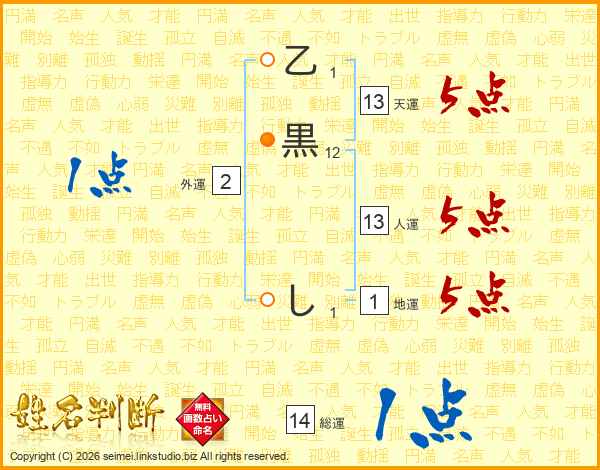 生活面を象徴する運勢です。外部から受ける影響力を表し、結婚運、家庭運や職場、環境への順応性を表します。総運から人運を引いた画数。姓や名が1文字の場合を除く。