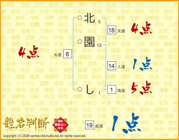 生活面を象徴する運勢です。外部から受ける影響力を表し、結婚運、家庭運や職場、環境への順応性を表します。総運から人運を引いた画数。姓や名が1文字の場合を除く。