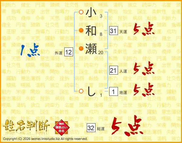 生活面を象徴する運勢です。外部から受ける影響力を表し、結婚運、家庭運や職場、環境への順応性を表します。総運から人運を引いた画数。姓や名が1文字の場合を除く。