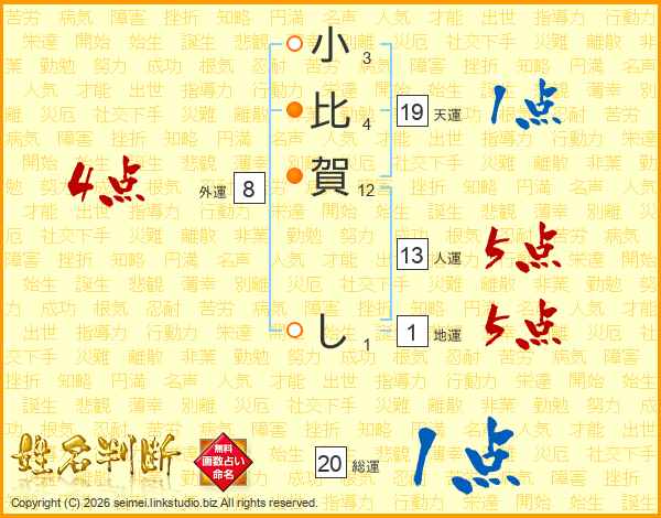 生活面を象徴する運勢です。外部から受ける影響力を表し、結婚運、家庭運や職場、環境への順応性を表します。総運から人運を引いた画数。姓や名が1文字の場合を除く。