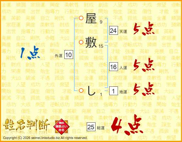 家系が持つ宿命的な運勢を表します。祖先から受け継いだ苗字ですので自分の力が及びません。家柄を象徴します。苗字の合計画数。