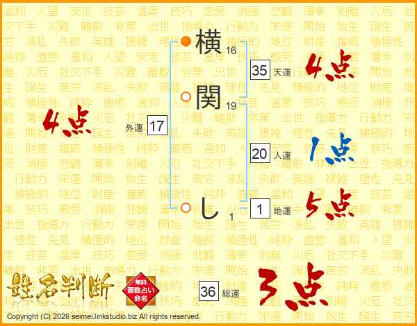 生活面を象徴する運勢です。外部から受ける影響力を表し、結婚運、家庭運や職場、環境への順応性を表します。総運から人運を引いた画数。姓や名が1文字の場合を除く。