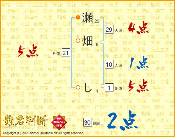 家系が持つ宿命的な運勢を表します。祖先から受け継いだ苗字ですので自分の力が及びません。家柄を象徴します。苗字の合計画数。