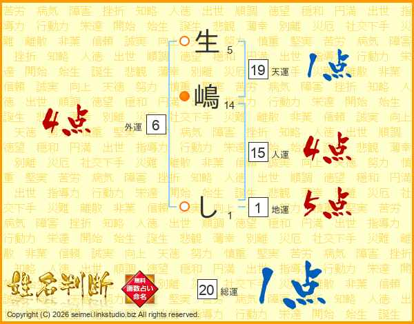 生活面を象徴する運勢です。外部から受ける影響力を表し、結婚運、家庭運や職場、環境への順応性を表します。総運から人運を引いた画数。姓や名が1文字の場合を除く。