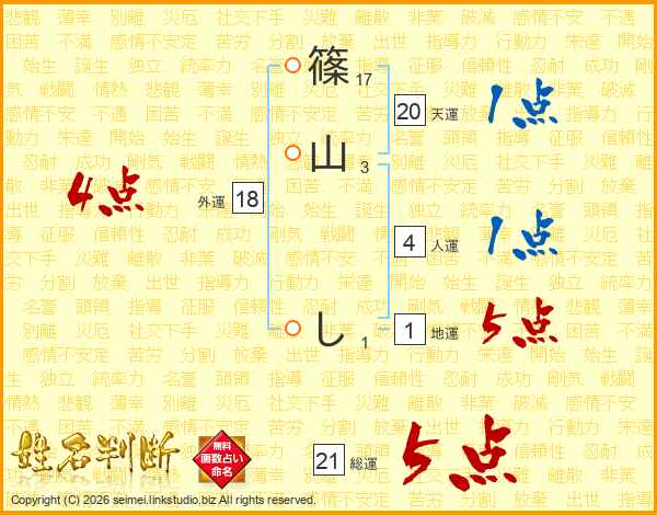 生活面を象徴する運勢です。外部から受ける影響力を表し、結婚運、家庭運や職場、環境への順応性を表します。総運から人運を引いた画数。姓や名が1文字の場合を除く。