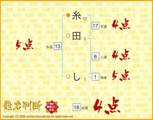 生活面を象徴する運勢です。外部から受ける影響力を表し、結婚運、家庭運や職場、環境への順応性を表します。総運から人運を引いた画数。姓や名が1文字の場合を除く。