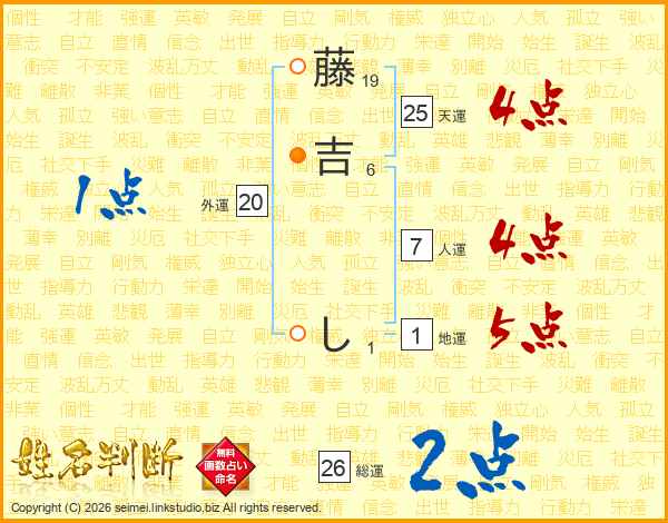 生活面を象徴する運勢です。外部から受ける影響力を表し、結婚運、家庭運や職場、環境への順応性を表します。総運から人運を引いた画数。姓や名が1文字の場合を除く。