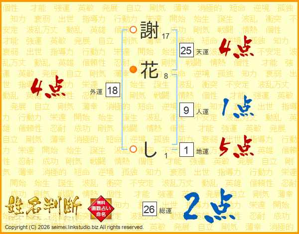 謝花しさんの総運は26画の2点!