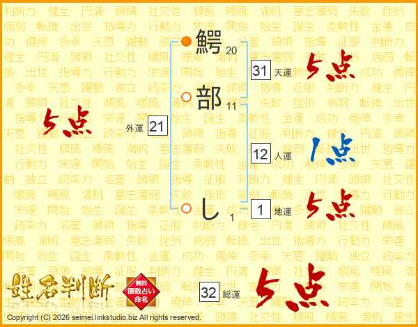 生活面を象徴する運勢です。外部から受ける影響力を表し、結婚運、家庭運や職場、環境への順応性を表します。総運から人運を引いた画数。姓や名が1文字の場合を除く。