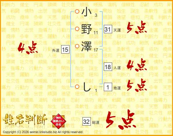 小野澤しさんの総運は32画の5点