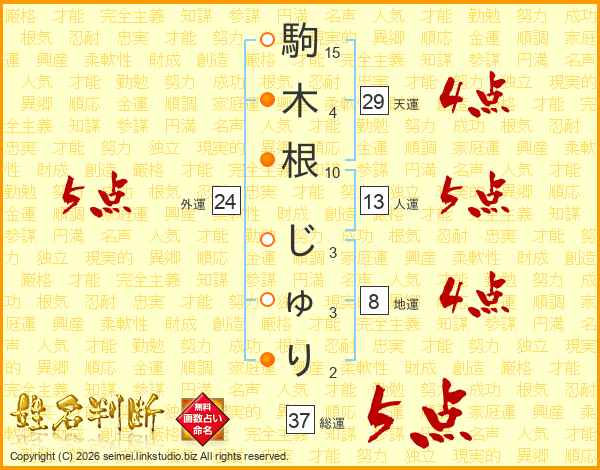 駒木根じゅりさんの総運は37画の5点!