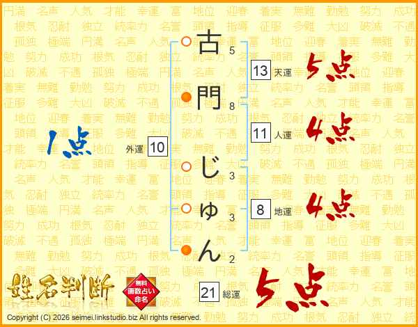 古(5画)門(8画) じ(3画)ゅ(3画)ん(2画)
