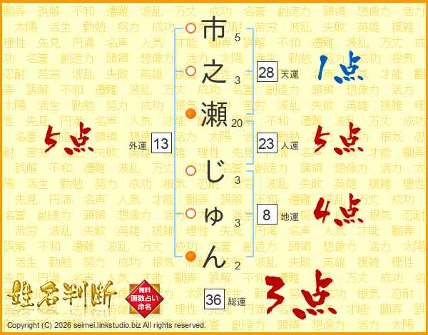 市(5画)之(3画)瀬(20画) じ(3画)ゅ(3画)ん(2画)