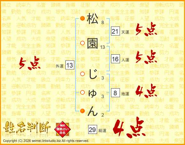松(8画)園(13画) じ(3画)ゅ(3画)ん(2画)