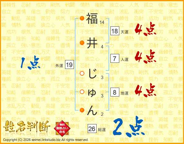 福(14画)井(4画) じ(3画)ゅ(3画)ん(2画)