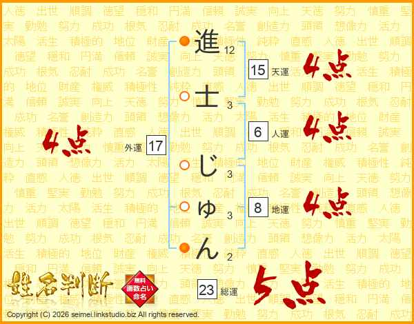 進(12画)士(3画) じ(3画)ゅ(3画)ん(2画)