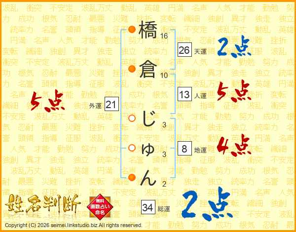 橋(16画)倉(10画) じ(3画)ゅ(3画)ん(2画)
