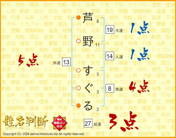 芦野すぐるさんの総運は27画の3点!