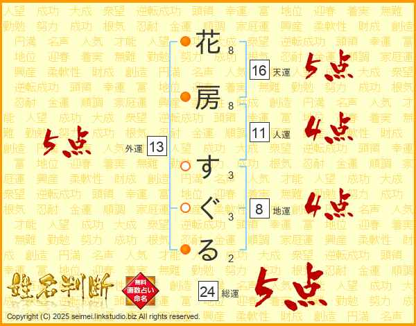 花(8画)房(8画) す(3画)ぐ(3画)る(2画)