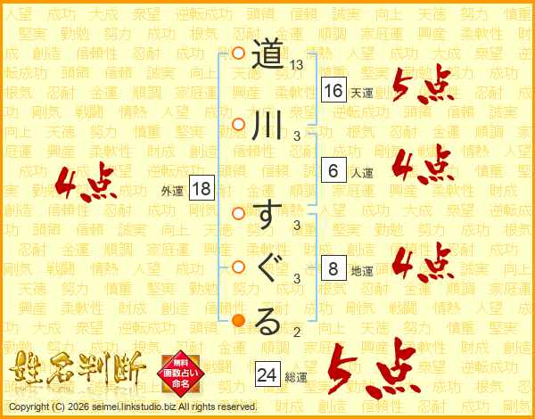 道川すぐるさんの総運は24画の5点!