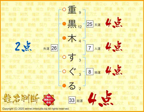 重(9画)黒(12画)木(4画) す(3画)ぐ(3画)る(2画)