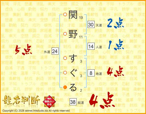 生活面を象徴する運勢です。外部から受ける影響力を表し、結婚運、家庭運や職場、環境への順応性を表します。総運から人運を引いた画数。姓や名が1文字の場合を除く。
