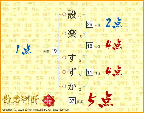設(11画)楽(15画) す(3画)ず(5画)か(3画)
