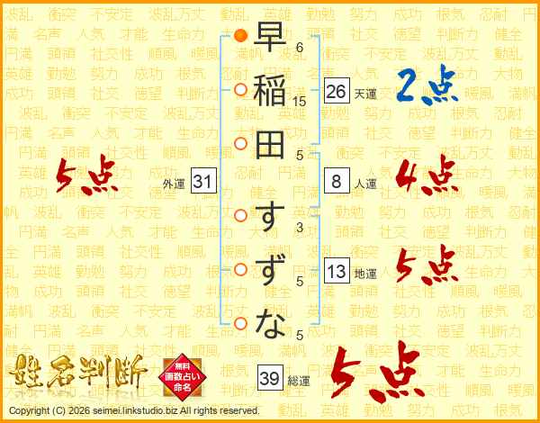 早(6画)稲(15画)田(5画) す(3画)ず(5画)な(5画)