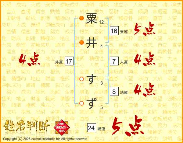 生活面を象徴する運勢です。外部から受ける影響力を表し、結婚運、家庭運や職場、環境への順応性を表します。総運から人運を引いた画数。姓や名が1文字の場合を除く。
