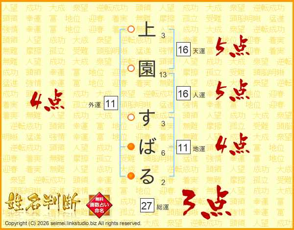 上園すばるさんの総運は27画の3点!