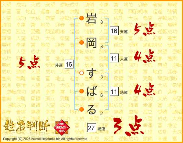 岩(8画)岡(8画) す(3画)ば(6画)る(2画)