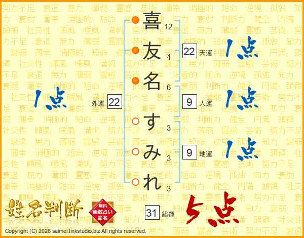 喜友名すみれさんの総運は31画の5点!
