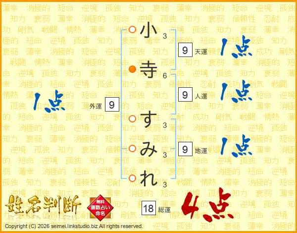 生活面を象徴する運勢です。外部から受ける影響力を表し、結婚運、家庭運や職場、環境への順応性を表します。総運から人運を引いた画数。姓や名が1文字の場合を除く。
