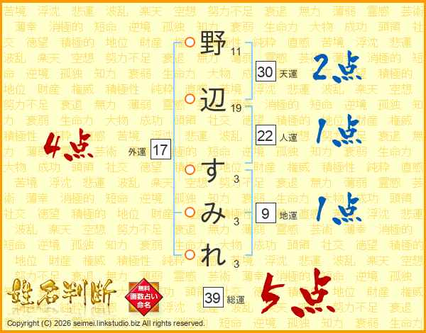 野辺すみれさんの総運は39画の5点!