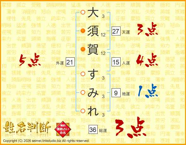 大(3画)須(12画)賀(12画) す(3画)み(3画)れ(3画)
