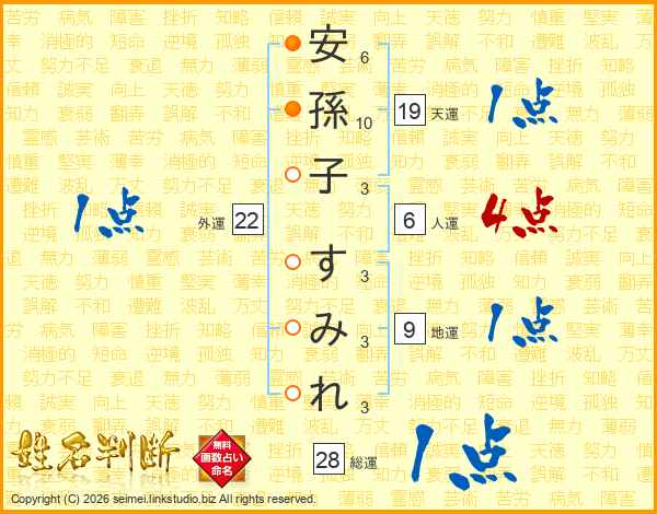 安(6画)孫(10画)子(3画) す(3画)み(3画)れ(3画)