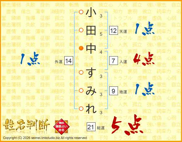 小田中すみれさんの総運は21画の5点!